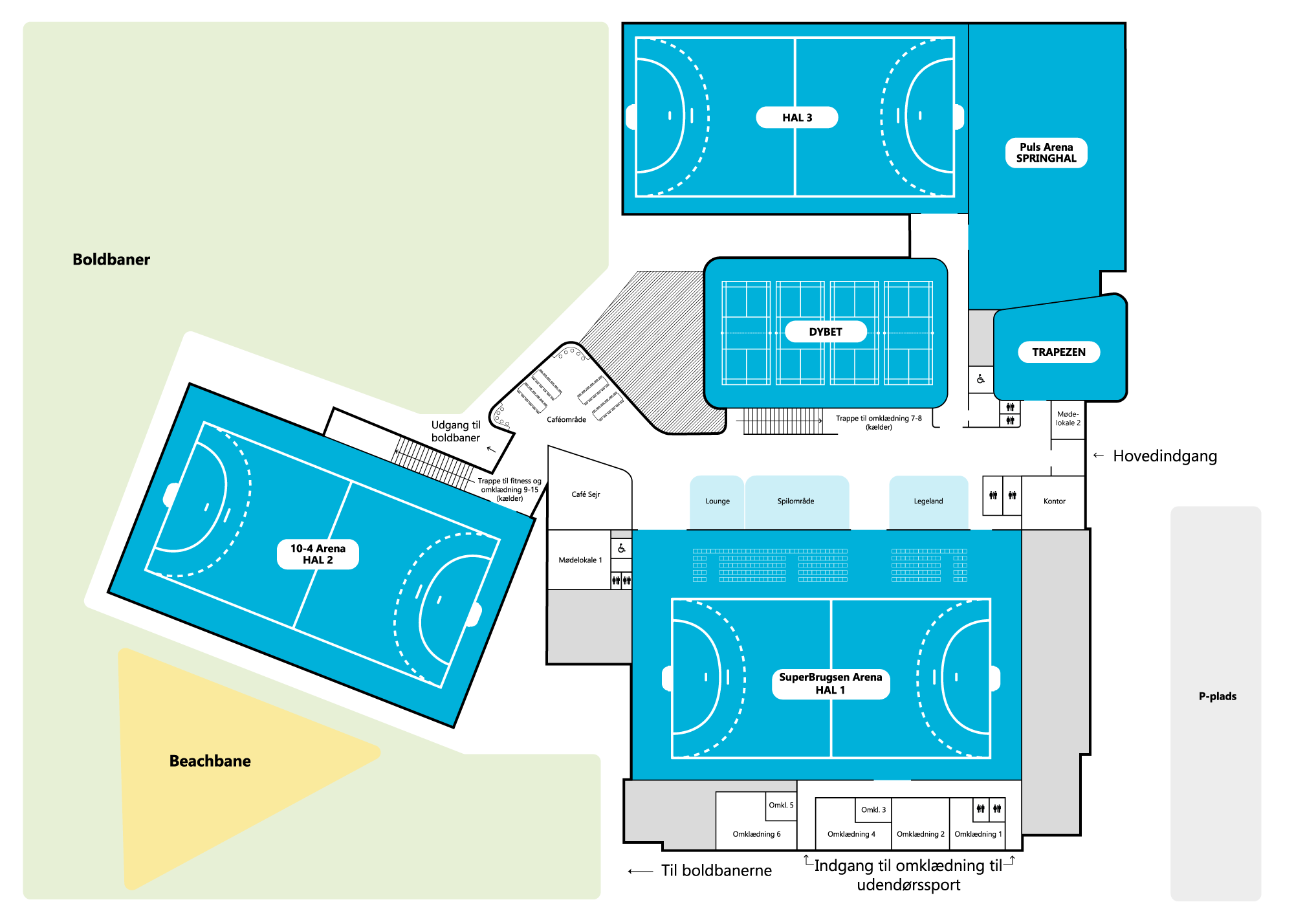 Hal 3 er åbnet i sommeren 2023 – Hallen har sportgulv med 20mX40m bane, scoretavle og dommerbord – Hallen ligger ved siden af Springsalen i den nordlig del af centeret.